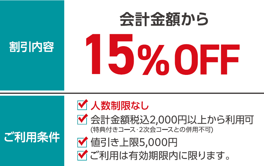 (二次会コース・特典付きコース、他のキャンペーンや割引券、単品飲み放題・食べ放題等との併用不可)